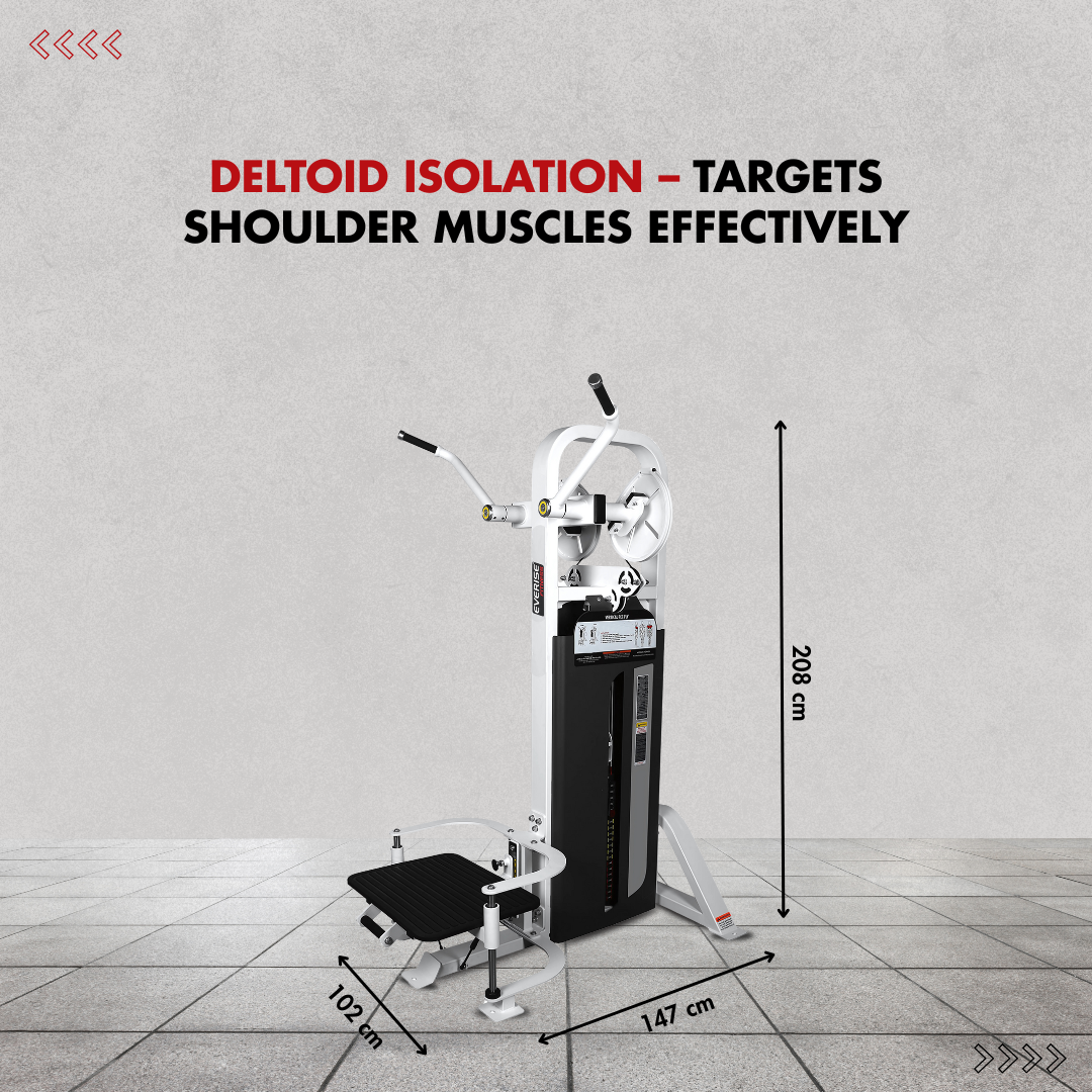 It effectively targets the lateral deltoids during lateral raise movements to help build shoulder width and definition, while the vertical pec fly function emphasizes the chest muscles for improved upper-body strength and muscular balance. Secondary engagement includes the front deltoids and upper chest, supporting well-rounded upper-body development.