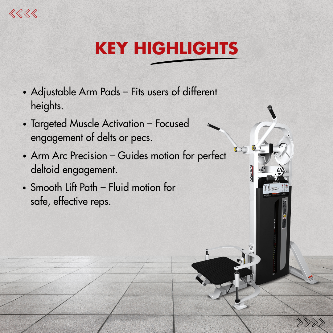 The Lateral Raise/Vertical Pec Fly machine is a dual-function strength station designed to deliver focused shoulder and chest workouts in a single, space-efficient system.