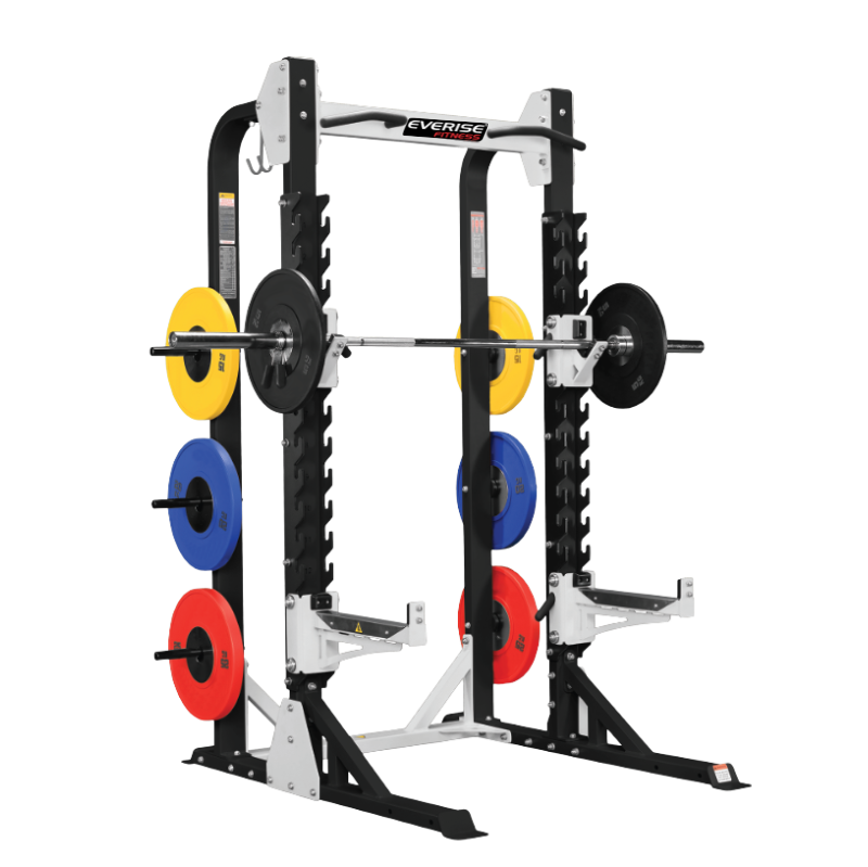 The Half Rack is a versatile strength training station designed for safe and effective weightlifting. Featuring sturdy uprights, adjustable J-hooks, and safety spotter arms, it allows users to perform exercises like squats, bench presses, overhead presses, and deadlifts with confidence. Its open design offers freedom of movement while still providing stability and security.