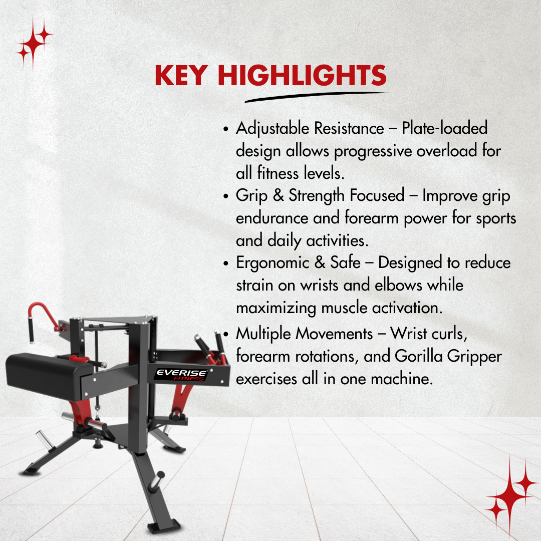 The Forearm Jungle (Wrist Curl, Gorilla Gripper, Forearm Rotation) is an all-in-one forearm training machine for complete arm development, built for athletes, lifters, and anyone serious about grip strength. Instead of switching between multiple setups, this compact unit brings everything together in one powerful station. It supports wrist curl, gorilla gripper, and forearm rotation exercises, allowing you to target flexors, extensors, and rotational strength in a focused and efficient way.